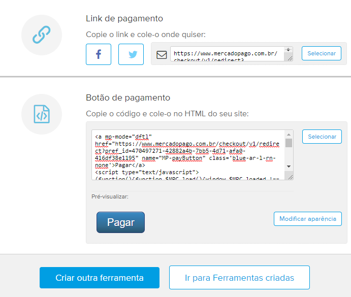 3) Quando preencher as informações do seu pagamento, uma tela com o link vai aparecer. Basta enviá-lo para o seu cliente.