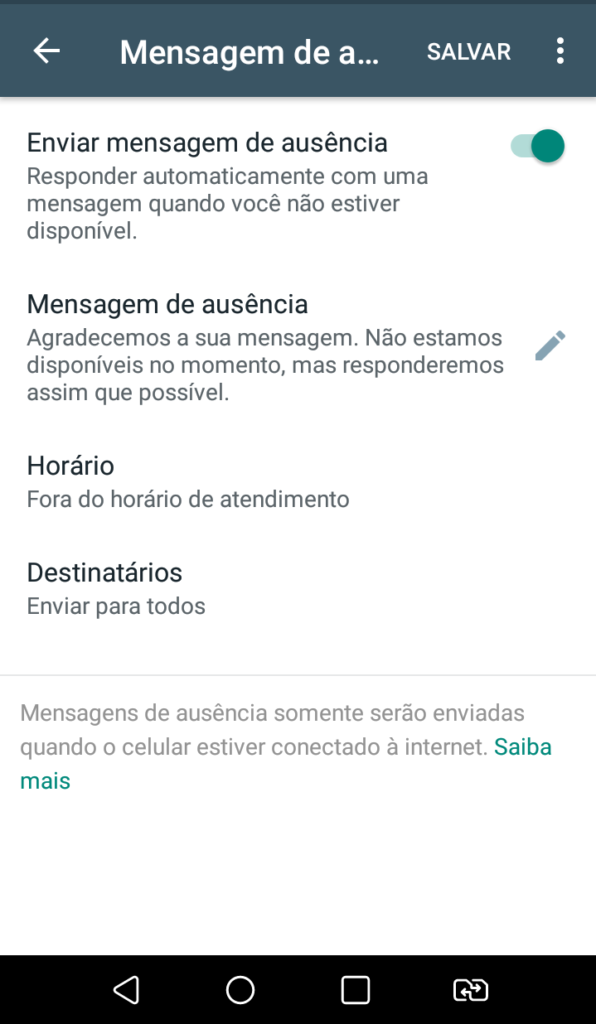 Serve para educar o público da sua loja a respeito do horário de funcionamento. Quem enviar mensagens fora do expediente vai receber uma resposta automática previamente configurada pelo dono da conta. O recurso é eficiente para evitar um turbilhão de mensagens em ocasiões impróprias.
