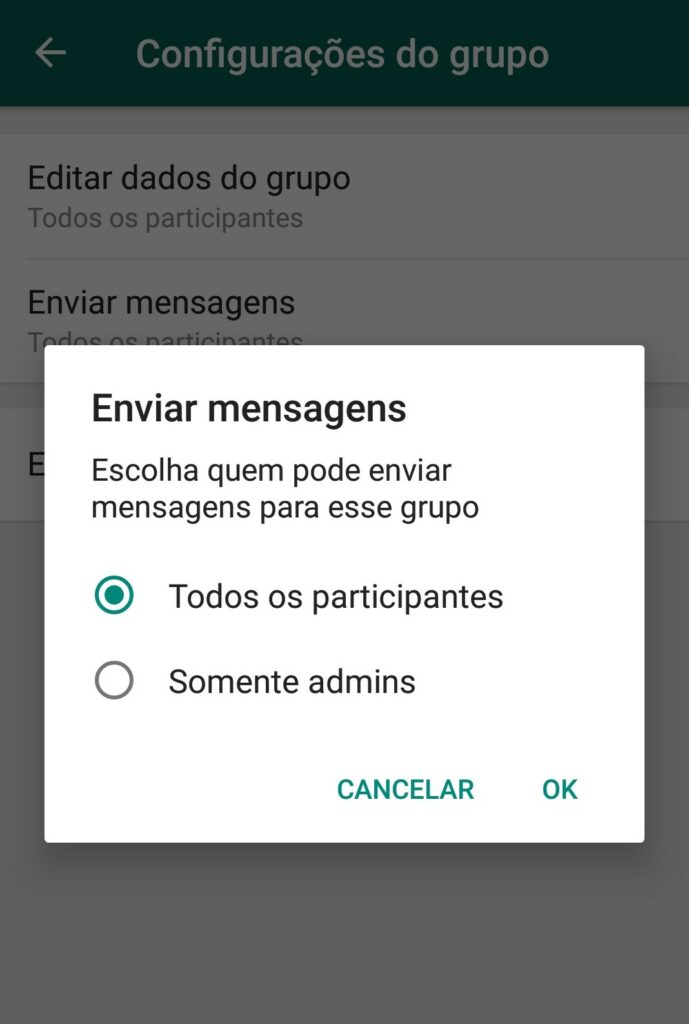 Atenção: grupos no WhatsApp podem ser difíceis de gerenciar por períodos longos de tempo. Se você quiser evitar discussões ou conversas improdutivas entre os participantes, selecione o menu “configurações do grupo” e edite quem pode enviar mensagens.